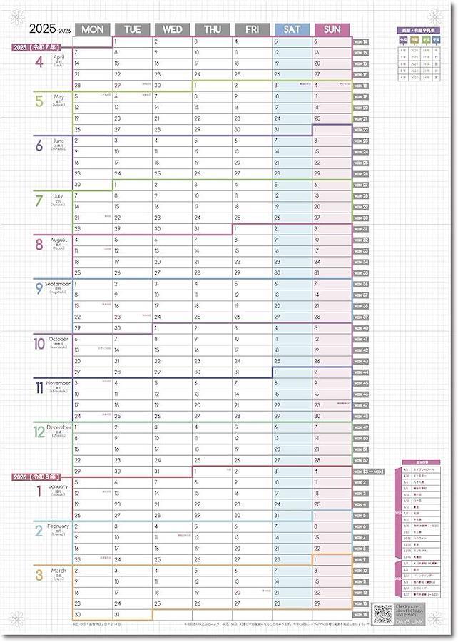 年間スケジュールがたてやすい、ウィークナンバー付き。