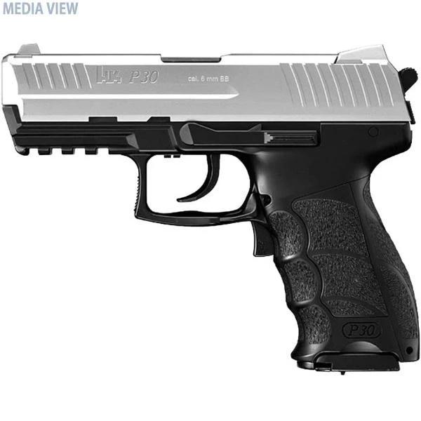 東京マルイ No.5 HK P30スライドシルバー フルオート 10歳以上電動ブローバック ヘッケラー&コック社が開発した最新鋭ピストル。グリップの特徴的なすべり止め形状や、ステンレスを思わせるシルバーのスライド採用したスタイリッシュなモデルです。発射時にスライドが後退するブローバックを再現。より楽しいシューティングを演出します。トリガーを引いている間連続で発射するフルオートモードを搭載。トリガー前方のセレクターレバーを操作することで、フル/セミオート発射をワンタッチで切り替えることができます。グリップ前方にレバー式のセフティを設置。グリップをにぎりながらセフティレバーをおし込むことで発射が可能です。グリップ内に作動用の単4電池をスッキリ収納。装弾数16発の専用マガジンが付属します。[セット内容]P30本体、マガジン (装弾数16発)、保護キャップ、取扱い説明書、クリーニングロッド、BB弾 (0.12g/100発)、他。【警告】対象年齢10歳以上