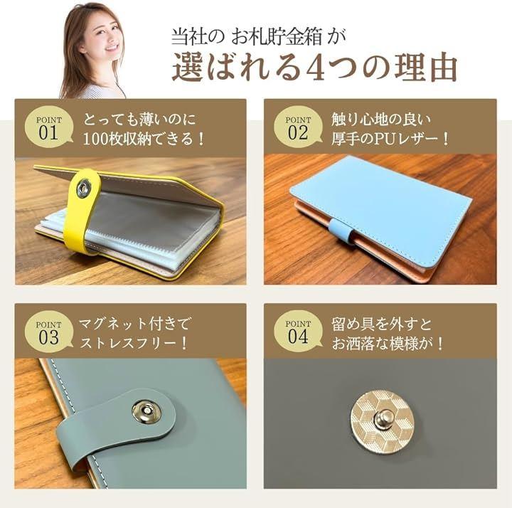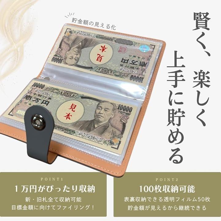 「100万円を目指せる達成感」最大100枚のお札を収納できる本製品は、目標額「100万円」の貯金が可能で、達成感を味わえる設計です。