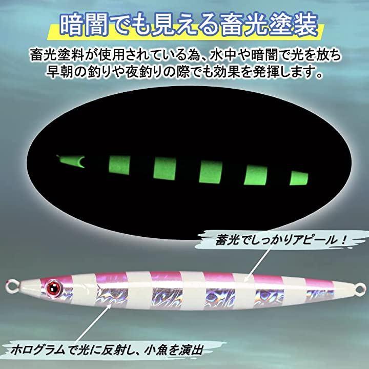 蓄光塗料が塗られているので水中や、暗闇で光を放ち早朝の釣りや夜釣りの際にも効果を発揮します。