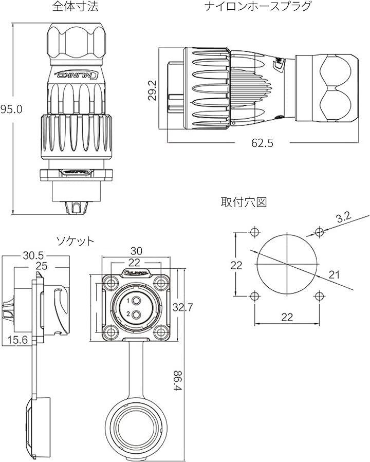 商品仕様 : オスプラグx1、メスソケットx1、取り付け穴:Φ21mm。