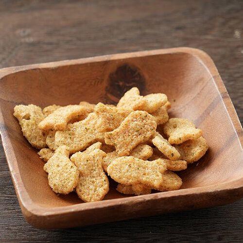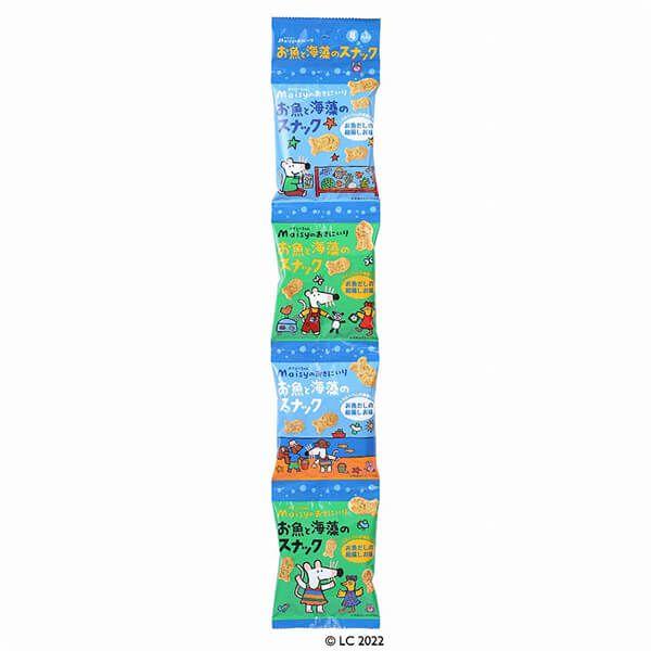 メイシーちゃんのおきにいりお魚と海藻のスナックは国産大豆の大豆粉・おから粉にかつお・いわし粉末を加えた「お魚だしの和風しお味」のかわいいお魚の形をしたスナックです。