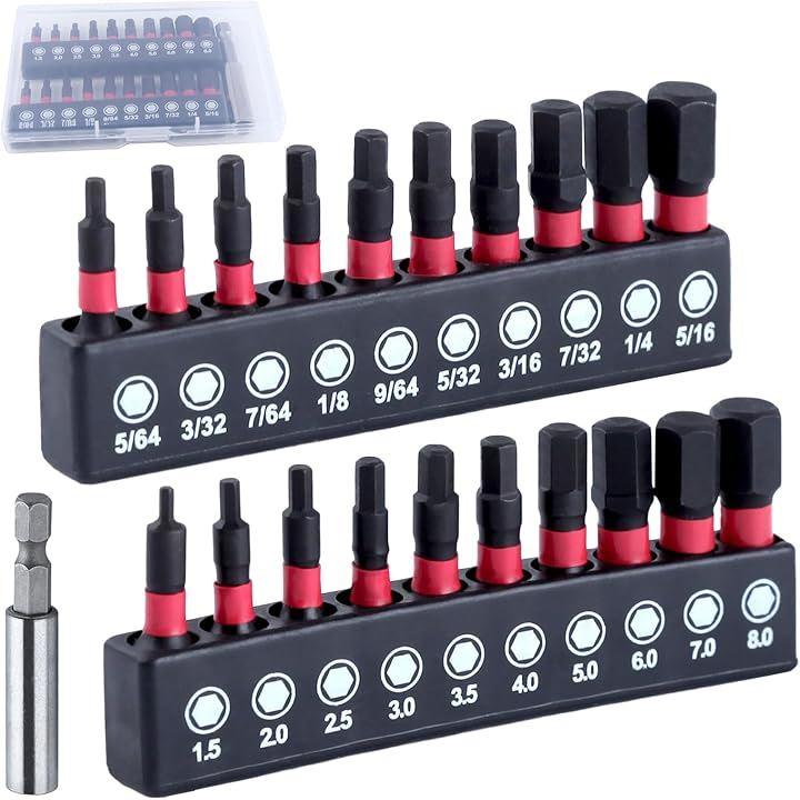 内容:1インチメートル ビット10個: 1.5/2/2.5/3/3.5/4/5/6/7/8mm;1インチインチ ビット10個: 5/64、3/32、7/64、1/8、9/64、5/32、3/16、7/32、1/4、5/16インチ、1/4六角シャンクジョイント、透明収納ボックス付き、収納と持ち運びが簡単。