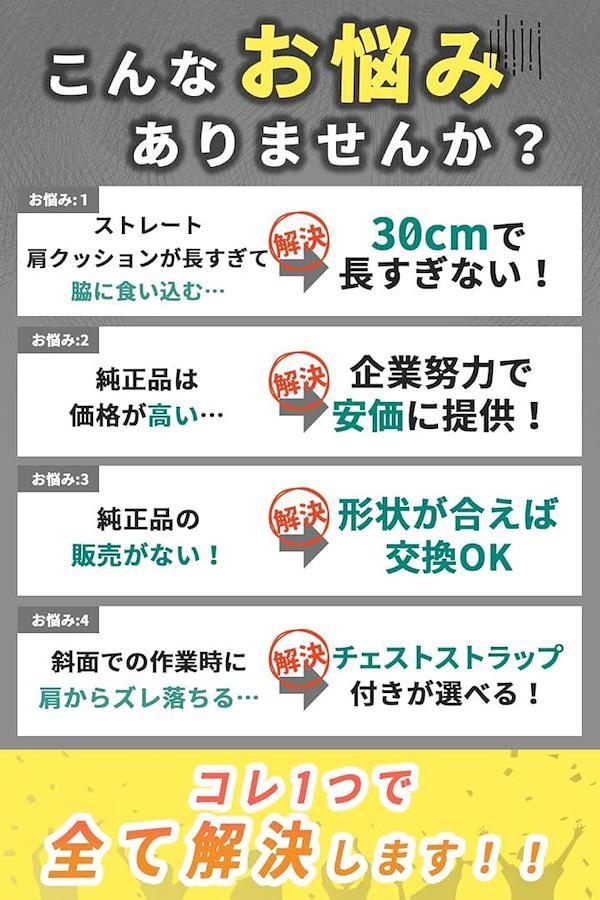 「商品詳細」 レギュラー肩クッションは、最大幅8cm、長さ30cm、厚さ1.3cmのストレートクッションを採用し、荷重の圧力を分散することで、痛みや疲労を軽減します。