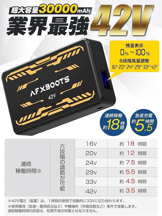 稼働時間:16V(約18時間)、20V(約12時間)、24V(約7.5時間)、29V(約5.5時間)、33V(約4.5時間)、42V(約3.5時間)