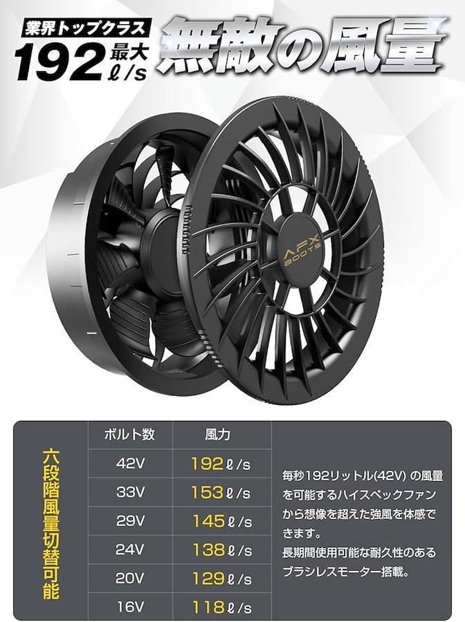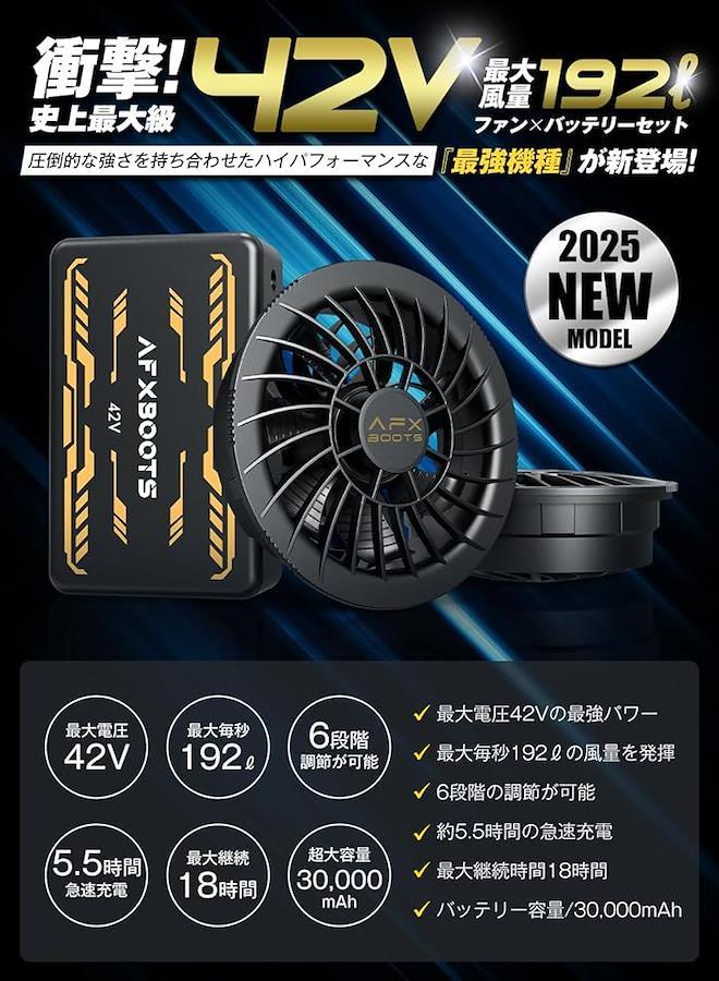 「42V超高出力・192L/s特大風量」42Vバッテリーに進化。新型暴風ファンと組み合わせて瞬間冷却可能な192リットル/秒の風量を実現しました。