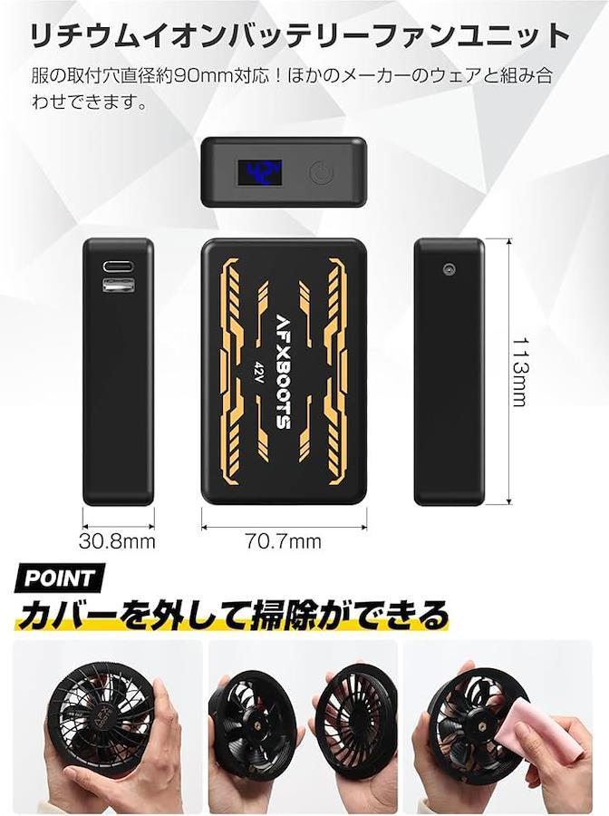 「バッテリー+ファンセット」最大192リットル/秒大風量x42V超高出力ファンバッテリー。暴風感はいっそう強く、衝撃的な爽快感を生み出す。お手元の空調着の性能を発揮できます。
