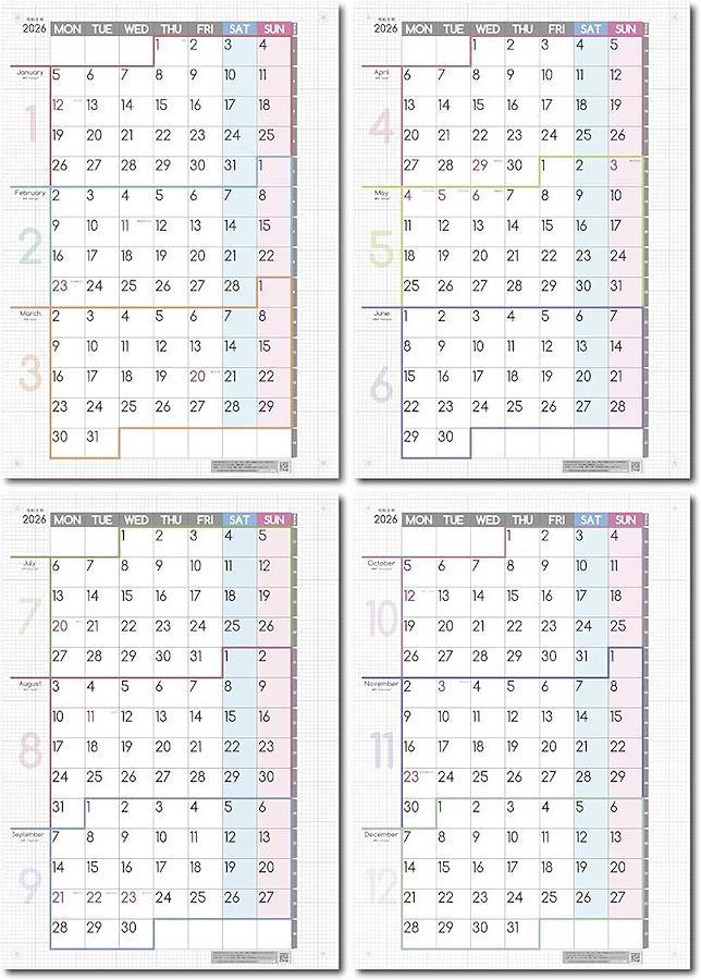各月の境目は色違いの太線で区切ってあるのでわかりやすい。