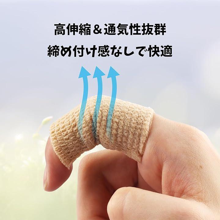 「素材とサイズ」不織布天然ラテックス製で、幅約5cm、伸びた状態で約4.5mの長さがあります。