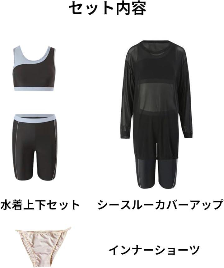 スポーツブラ+ショートパンツ+ロングカバーアップに加え、安心のアンダーショーツ付きで透け防止もバッチリ。