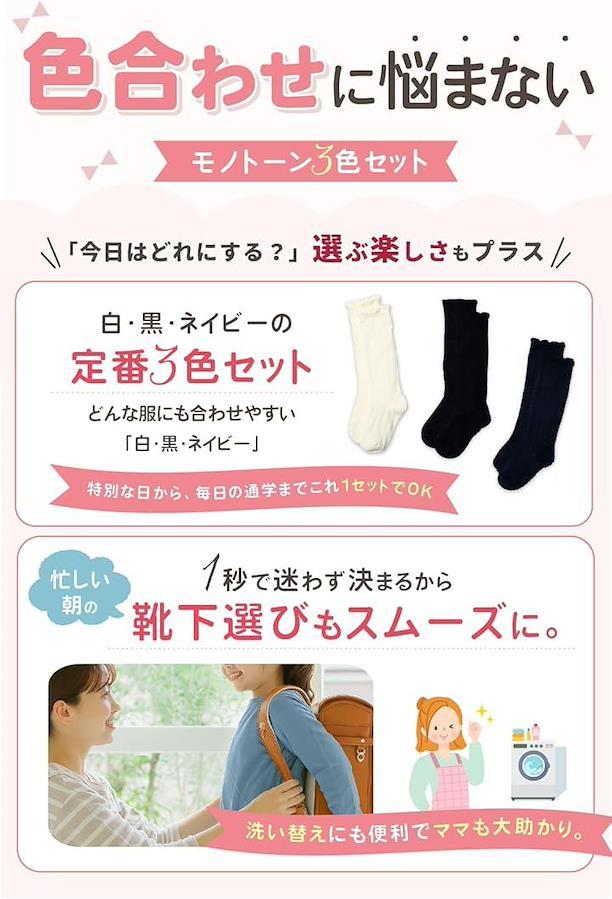 「使いやすい2色セット」白・白・黒のモノトーンカラーが揃った、上品でシンプルなキッズ用ハイソックス3足セット。