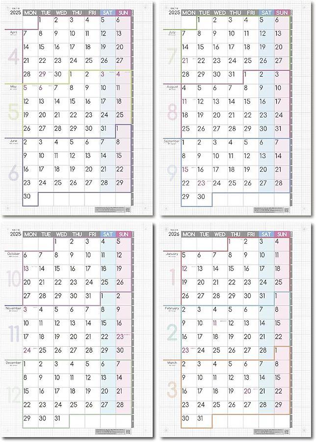 各月の境目は色違いの太線で区切ってあるのでわかりやすい。