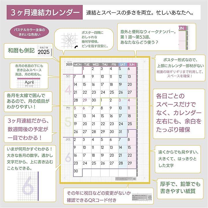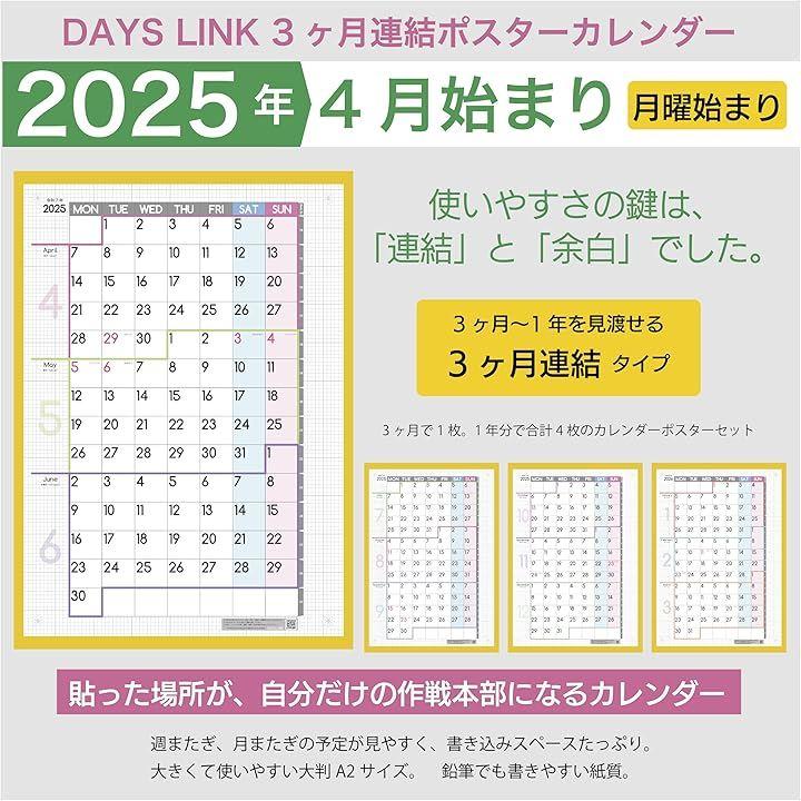レイアウト次第で3か月~1年を見渡せる、 A2サイズの3か月連結ポスターカレンダー。
