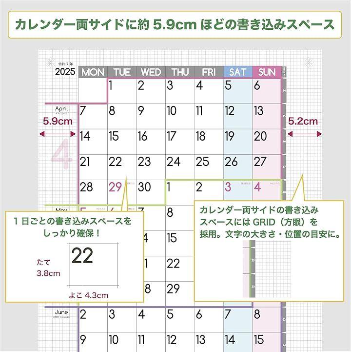 日にちごとの書き込みスペースは、もちろん、カレンダー両サイドにたっぷりと書き込みスペースを確保。