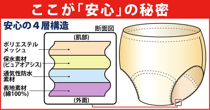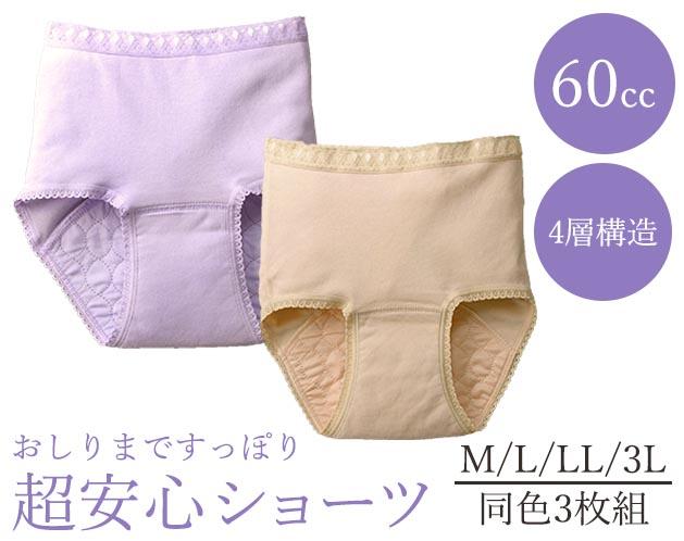 ★4層構造に加え、吸水パッド範囲を広げた60ccまで対応の安心ショーツ!*パット部分をショーツと同色にすることでより目立たなくなりました。*吸水だけでなく速乾・消臭にも優れたピュアオアシスを採用しております。*主婦が考えだした超安心ショーツ!前も後ろも大きく包んでくれるので少々のモレにもビクともしません。*洗い替えに便利な同色3枚セット!*ショーツ部分はよく伸びる素材を使用しており、締めつけない仕様でラクラク!*通気性に優れた特殊防水素材を使用しております。