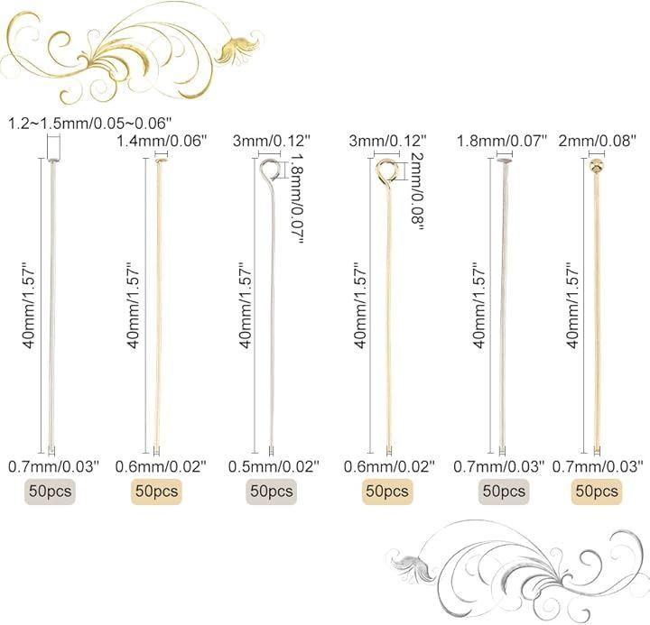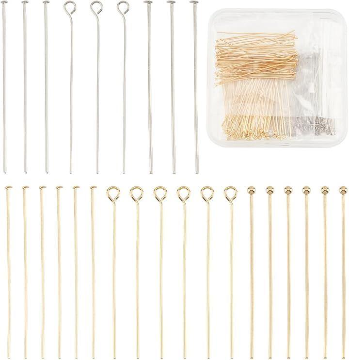 ゴールドとシルバーのジュエリー製作ピン:オープンアイピン、フラットヘッドピン、ボールヘッドピンの3スタイル、各スタイル2色のクラフトピン300本がパッケージに含まれています。