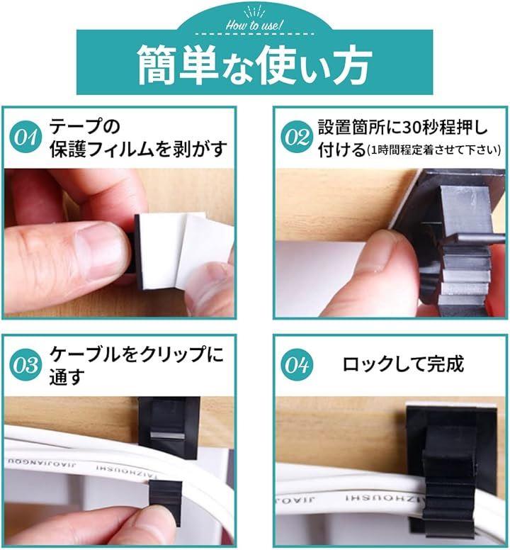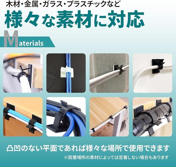 「工具不要でカンタン取付」取付はテープで貼るだけ。あとはケーブルを通してロックするだけなのであっという間にお部屋のケーブルをまとめることができます。木材、ガラス、プラスチック、金属などの様々な素材に対応。