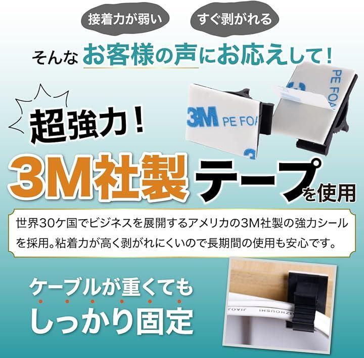 「ここが違う。新規採用の3M社製テープ」ご要望にお答えして粘着テープを3M社製のテープを新規独自採用し従来品から改良しました。TV、PC、デスクなどの配線をまとめることはもちろん、壁やデスクの裏などに固定して這わせたりと自由自在にケーブルを整理が可能。