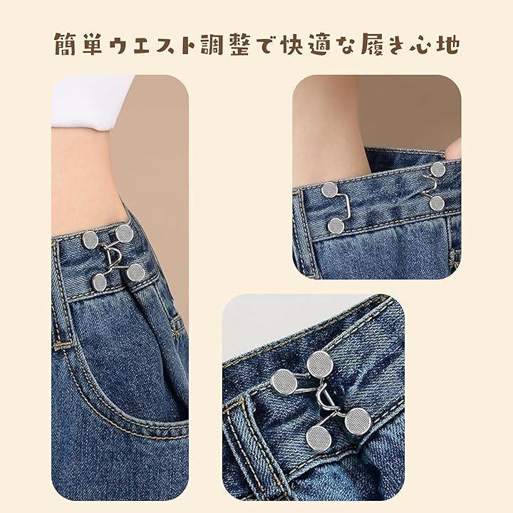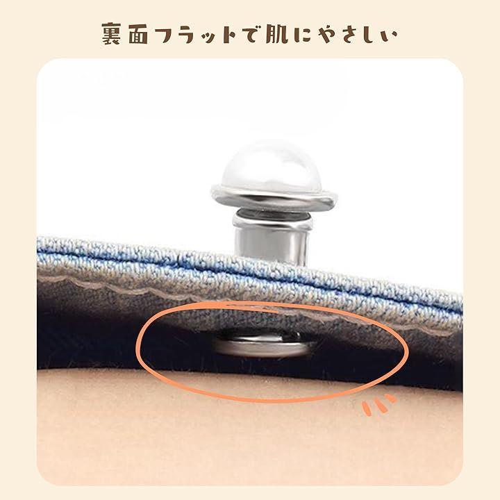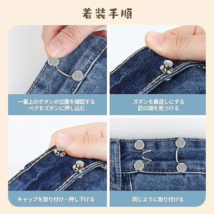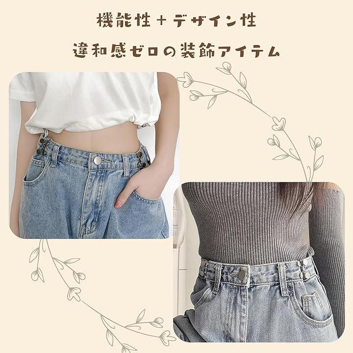 「簡単装着」ボタンを簡単に取り付けるだけで、ジーンズやスカートのウエストサイズを瞬時に調整できます。
