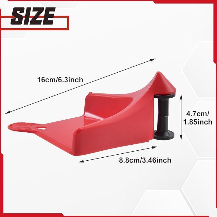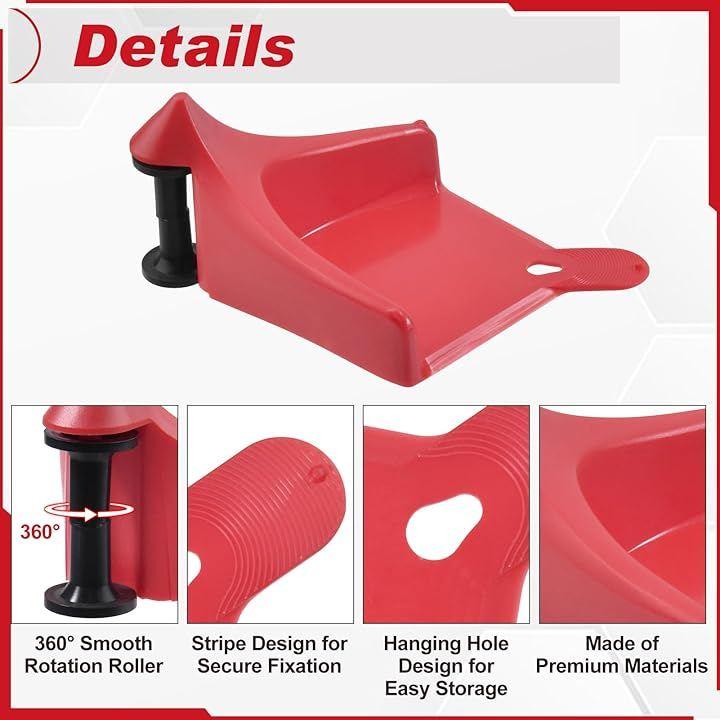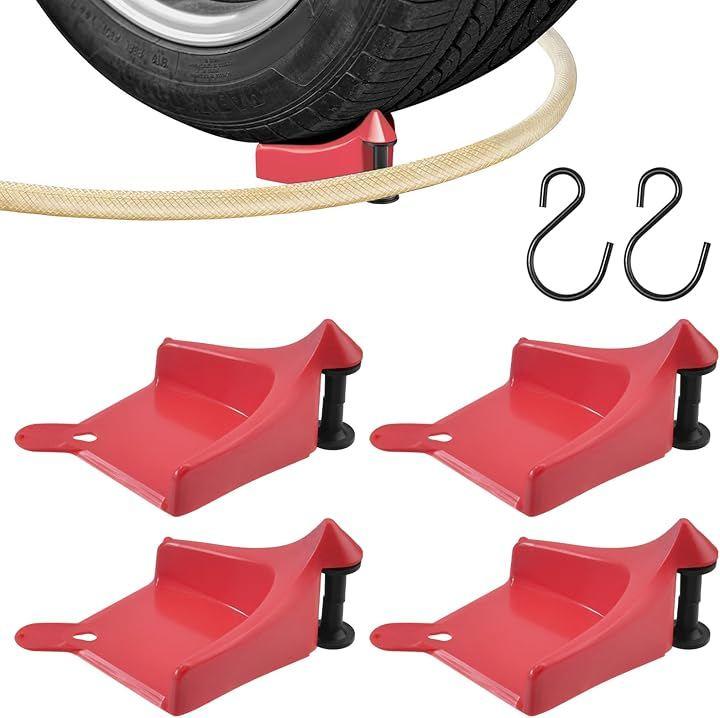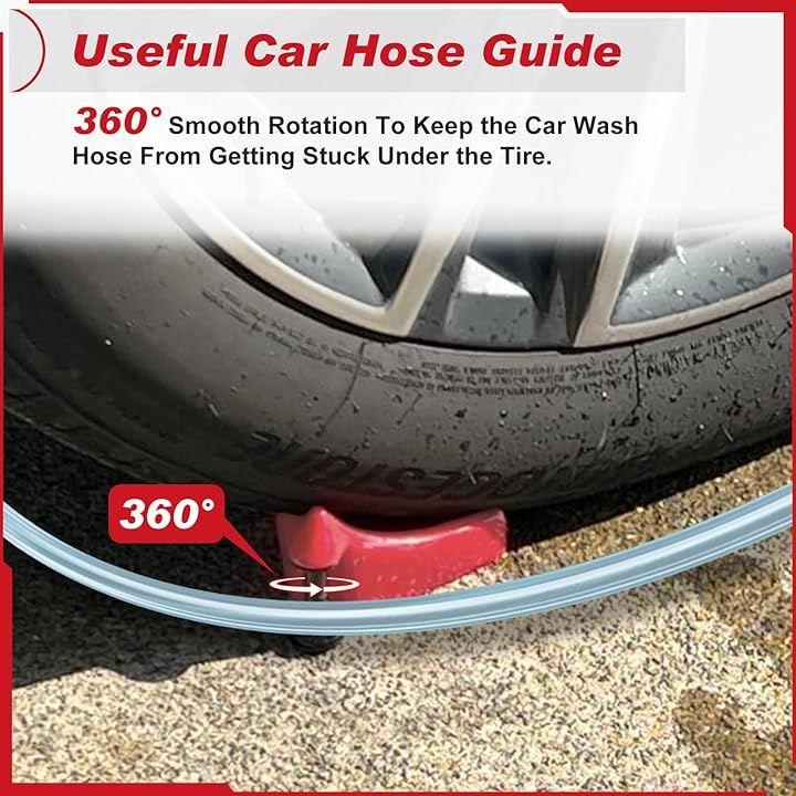 赤いプラスチック製のタイヤローラーが、ホースを車両のタイヤ周りにスムーズに誘導し、イライラする引っかかりや損傷を防ぎます。