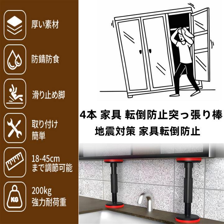 AmoreTempo 4本 家具転倒防止突っ張り棒 高さ18-45cm 耐震ポール 耐荷重約200kg 防災グッズ支え棒 伸縮可能 家具固定ポール ブランド: AmoreTempo カラー: ブラック 素材: ナイロンプラスチック製 仕様: 4 pcs 家具の設置や天井の隙間に最適で、耐震用品や防災用品としても使用できます. 本棚、冷蔵庫、ナイトテーブル、ドレッサー、キャビネット、ワードローブ、テーブル、洗面台、壁などの隙間に設置でき、家具の転倒を効果的に防止できます. 家具のサポート脚は、家具の底と地面との間のスペースを広げ、より簡単にクリーニングを行うことができます 2本のバット付き強力伸縮棒はとても軽量で、真ん中のスクリューポストをひねるだけで、サポートポールをお好みの高さに調節できます.工具や穴を開けずに簡単に取り付けられるので、体力に自信のない女性でも時間と労力を節約できます 画面上では大きく表示される場合があります.カラーマッチングにより実際の商品と写真とは若干異なる場合がございます.ご購入前にサイズをご確認ください.