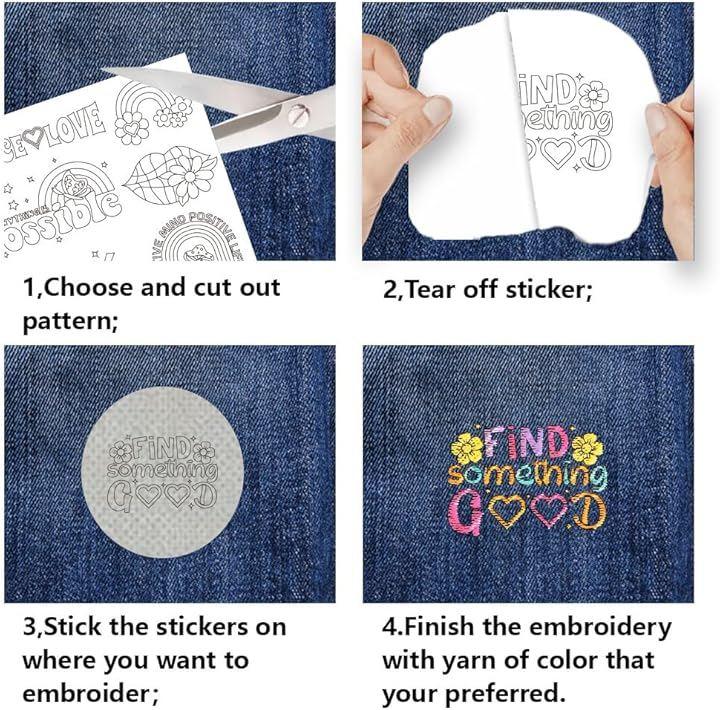 [使いやすい]--使い方は簡単まず好きな柄を切り抜き、貼り付けたい場所に柄を貼り付け、その上から好きな色を縫い付け、最後に水に数分間浸して完成です。