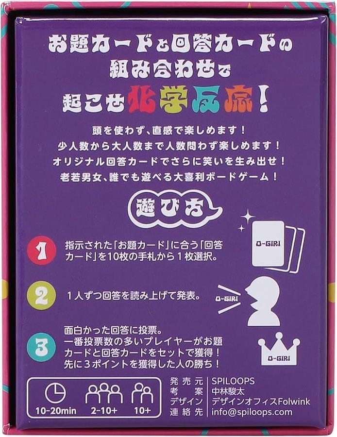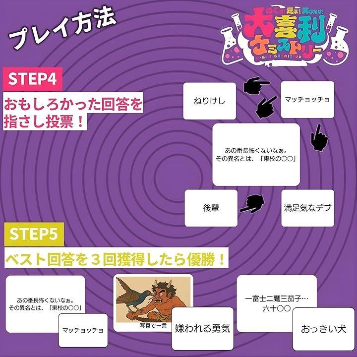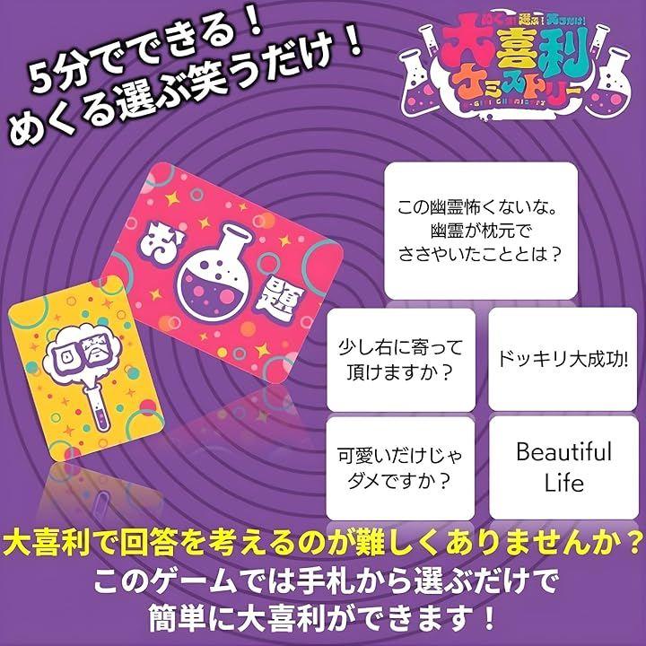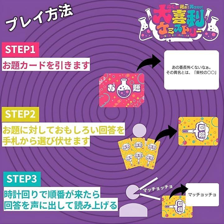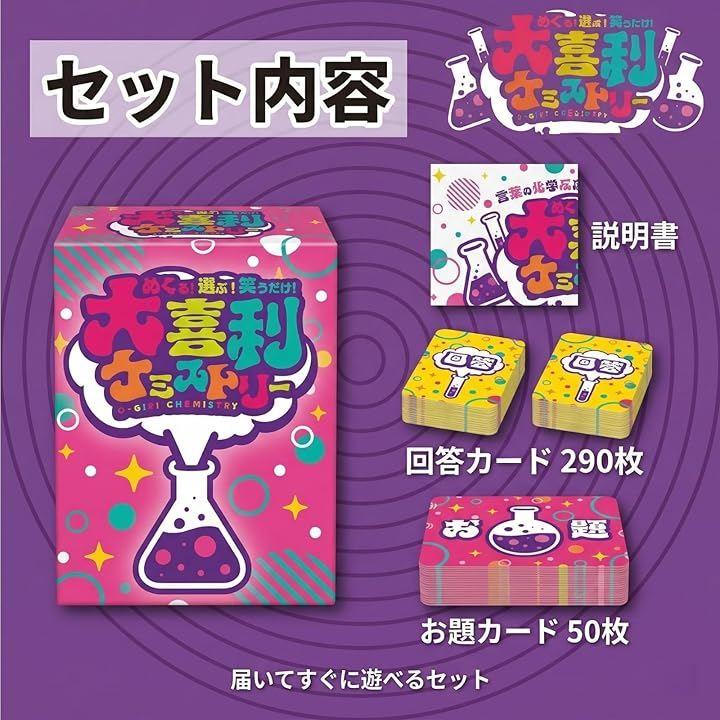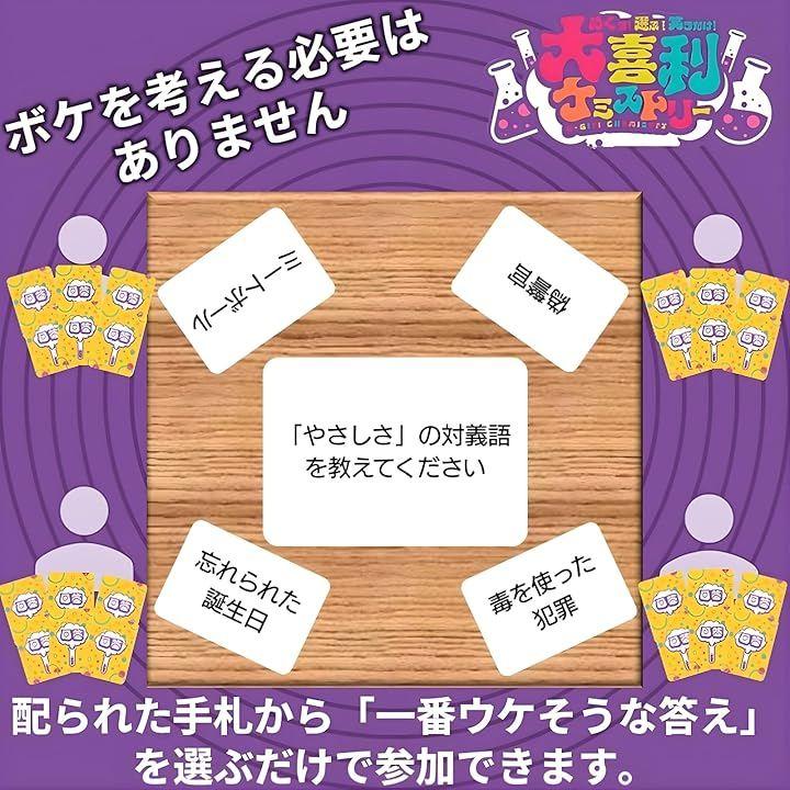 「言葉の化学反応で笑いを取れ。。」 大喜利ケミストリーは、“選ぶ>めくる>笑うだけ”で誰でもすぐ盛り上がる大喜利系カードゲームです。