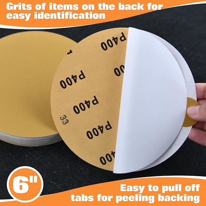 「デザイン」各サンドペーパーディスクには、裏紙をはがすための簡単なプルオフタブがあり、サンドペーパーディスクのPSA感圧接着剤を汚れから守ります。