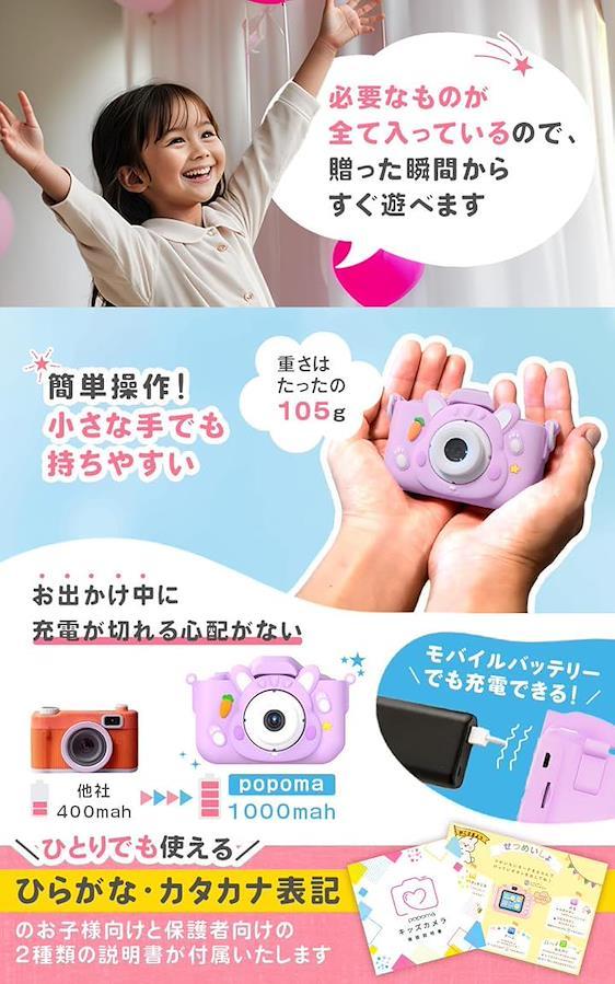 「popomaキッズカメラのおすすめポイント」キッズカメラには、かわいいウサギのポーチがセットになっています。