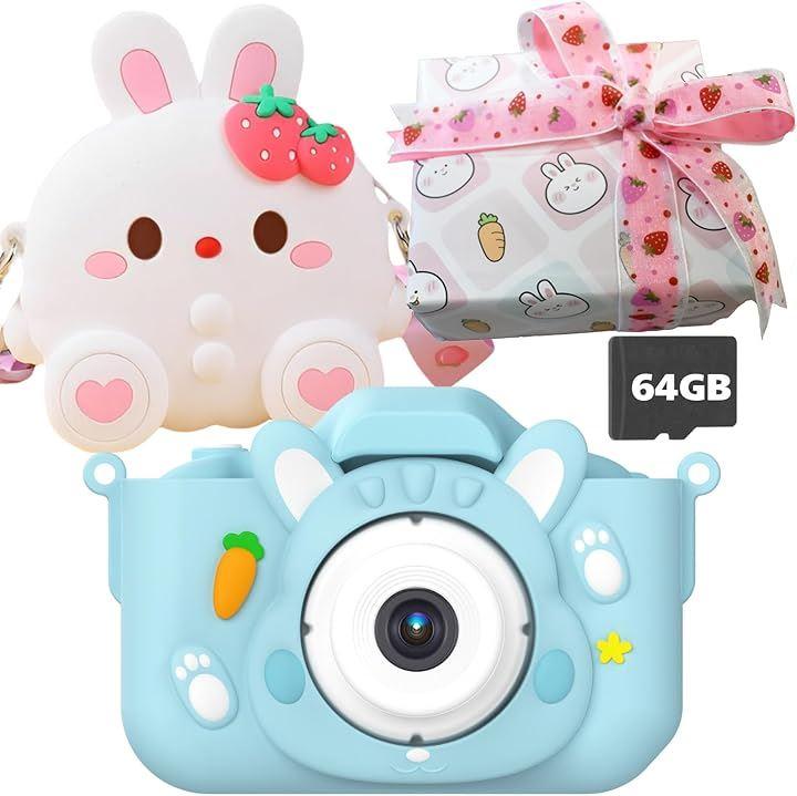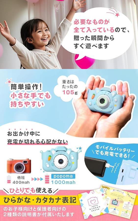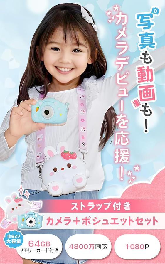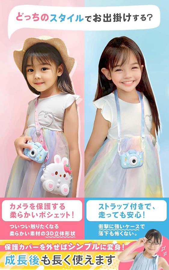 「popomaキッズカメラのおすすめポイント」キッズカメラには、かわいいウサギのポーチがセットになっています。