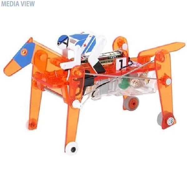 左右の後足を同時に動かして軽快に走る、ジョッキーをのせた競走馬のロボットです。モーターの回転を後足に伝え、リンクロッドで前足に伝達。効率よくキックできるように後足の先にはグリップ部品、前足の先には抵抗にならないようにローラーをセットしました。 単3電池1本使用 (別売)。