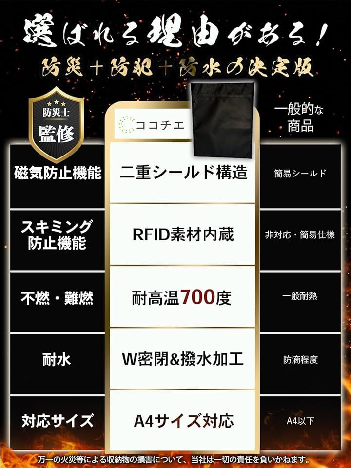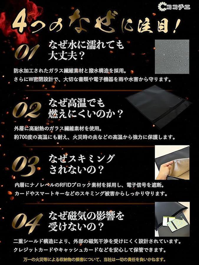 サイズ:43cm x 38cm x 1cm(A4対応) 重量:約200g 材質:高耐熱ガラス繊維+RFIDシールド素材(多層構造) 特徴:耐火・防水・RFIDスキミング防止・軽量・折りたたみ カラー:ブラック