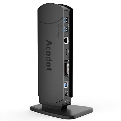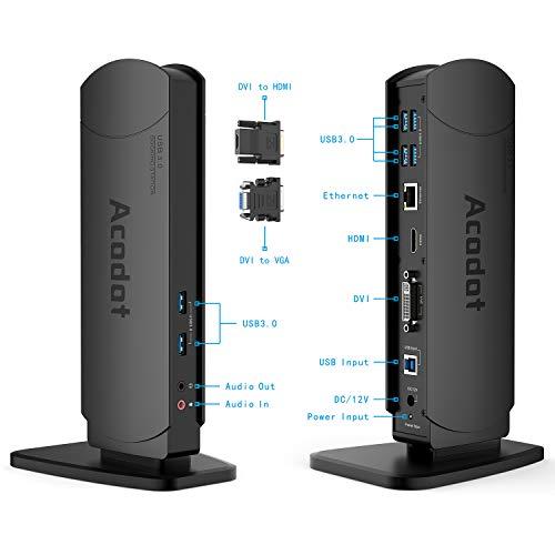 USBケーブル1本でHDMI/アナログディスプレイ出力、有線LAN接続、USBオーディオ接続、各種USBデバイスの拡張接続ができるUSB3.0ドッキングステーションです。USBポートからのディスプレイ増設(HDMI・VGA)(DVI to VGA やDVI to HDMI変換アダプター付き )に対応しており、簡単にマルチディスプレイ環境(ミラーモード/拡張モード)を実現できます。 HDMI端子(2560x1440) vga/ dvi端子(1920×1080)までをサポートしており大画面での作業が可能です。Gigabit Ethernet(10/100/1000Mbps スピード)に対応しているので、Gigabitネットワーク環境にも対応でき、USBケーブル1本で有線LAN接続をすることができます。USB3.0×6ポートを搭載し、キーボードやマウス、フラッシュドライブ、ハードドライブ、プリンター、MP3プレーヤー、様々なUSB3.0/USB2.0機器を接続でき、USBケーブル1本の接続で快適に使用できます。 「音声入出力」パソコン用スピーカー・マイクも接続でき、USBスピーカー・USBマイクとして利用することができます。幅広い互換性:Acodot USBドッキングステーションは、Windows 10、8.1、8、7、およびWindow XPシステムと互換性があり、Surface RT、Mac OS X、およびLinux / Unixをサポートしていません。充電器ではありません。iPad、iPhone または他のタブレットやスマートフォンを充電するための特別な機能はありません。 USB ドッキングステーションは、通常のアプリケーションでの使用をおすすめします。 (ゲームでの使用はおすすめしておりません。)ご購入前をご了承ください。【セット内容】:1 * USB 3.0ドッキングステーション、1 *AC電源アダプター 1 * USB 3.0 Type-Aオス-Type-Bオスケーブル(USB 2.0互換)、1 * DVI-to-VGA変換アダプター、1 * DVI-HDMI変換アダプター、1 * CD、1 *取扱説明書【1年保証】12ケ月の品質保証がついておりますので、商品につきまして何かご不良やご要望がございましたら、いつでもご気軽にお問合せください。