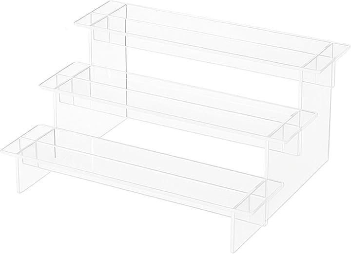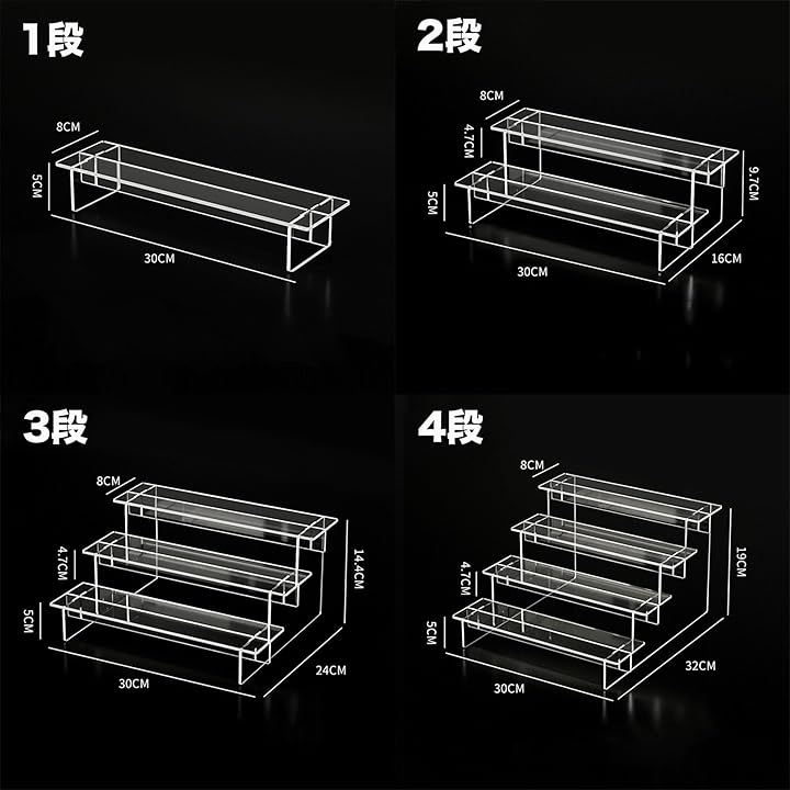 「選べる4サイズ展開」 素材:高透明アクリル/カラー:クリア/幅30cm共通/奥行x高さ:1段8x5cm・2段16x9.7cm・3段24x14.4cm・4段32x19cm。
