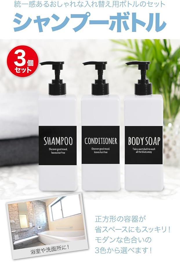 「統一感のある詰替え容器」方型の容器で浴室や洗面所など狭いスペースにも無駄なく収まります。