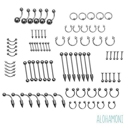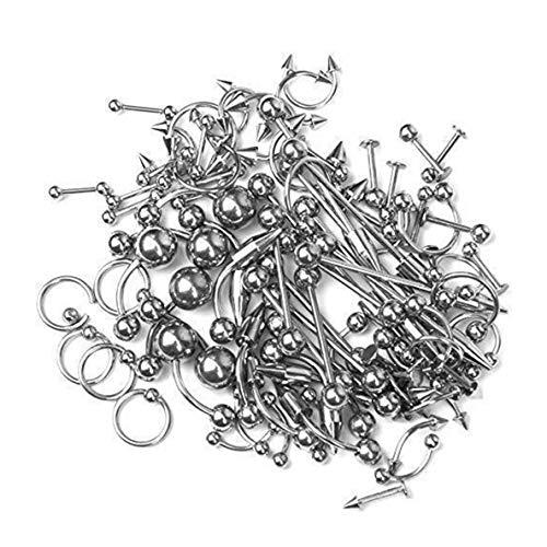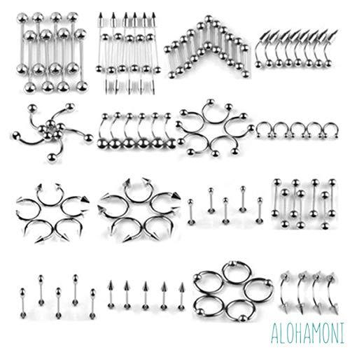 【セット内容】「ストレートバーベル」(耳、顔、口内、舌、体など)、「サーキュラーバーベル」(耳、口内など)、「カーブドバーベル」(顔、口内、指、体など)、「バナナバーベル」(臍、耳など)、「CBR」(耳、口内など)、「ラブレットスタッド」(口、舌など)