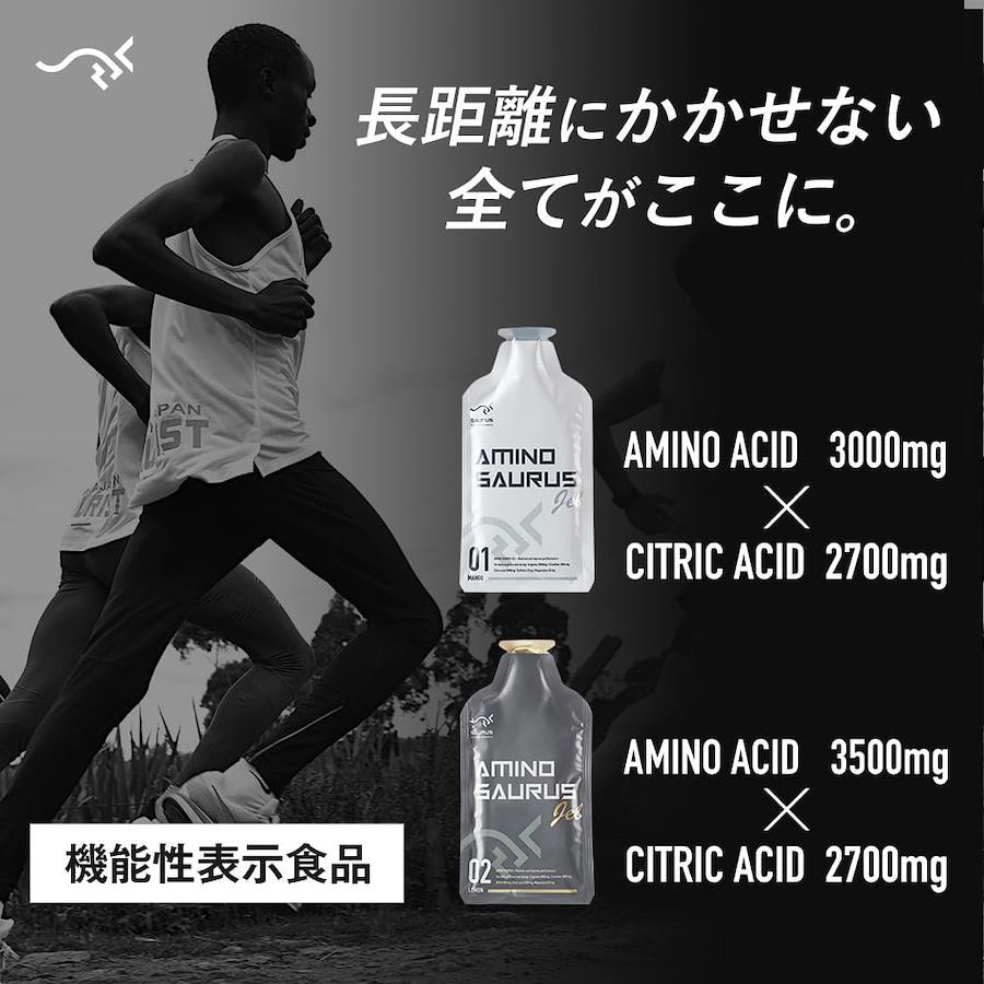 【プロ・アスリート仕様】レース中、ランナーに 必要なすべてをここに。持久戦や長距離に欠かせない成分を配合したオールインワンジェル《業界トップクラスアルギニン2,000mg》 【アミノ酸特化のSAURUS JAPANが開発】SAURUS JAPANは創業以来アスリートに必要なアミノ酸サプリメントを開発。アミノ酸商品には特にこだわっており、今まで業界のトップアスリートやトレーナー、モデルなどに愛用。 【国内製造の品質】厳選したアミノ酸の中で筋肉の構成成分を補給するアミノ酸を国内製造(GMP認定工場)にこだわり安心・安全な製法で仕上げ 【圧倒的なアミノ酸含有量と栄養価】 1個でアルギニン2000mg 、シトルリン1000mg、クエン酸2700mg 、マグネシウム50mgを摂取できるハイブリットジェル。日常の生活や運動後の疲労感を軽減する働きがあることが報告されている「クエン酸」2,700mg/個を配合した機能性表示食品にリニューアルしました。レモン味:エネルギー不足をサポートするBCAAを500mg配合。マンゴー味:カフェイン75mgを配合し持久戦の後半までしっかりサポートします。 【お召し上がり方】?距離?の練習時やマラソンレースでは10km毎の摂取を目安とし、基本はカフェインが?ってないレモンを先に摂取し、カフェイン?りのマンゴーを後半に使?いただくことをおすすめしています。パッケージの上部を切り取り、そのまま口をつけて押し出しながらお召し上がりください。