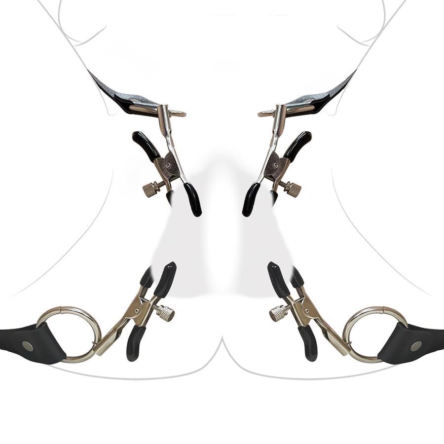 両端にクリップが付いたストラップタイプのアイテム。太ももに巻き付けることで、4点からやさしく陰唇を開く構造。ストラップ部分はなめらかなフェイクレザー素材で、素肌にも心地よくフィット。クリップ先端にはゴム加工が施されており、安全性に配慮。サイドのネジを使って、挟む力を好みに合わせて調整可能。デザイン性と機能性を兼ね備え、使用時の安定感と快適さを両立。