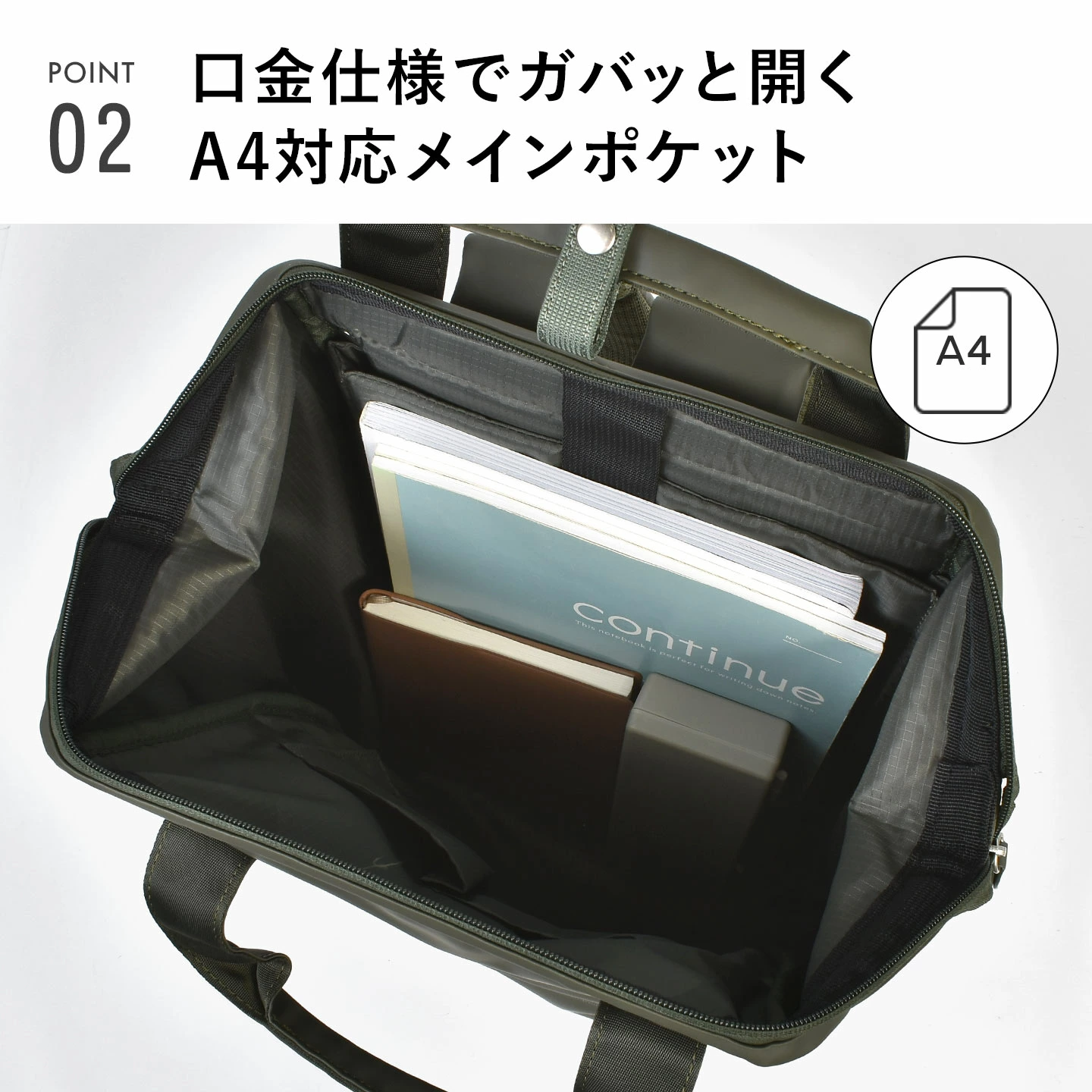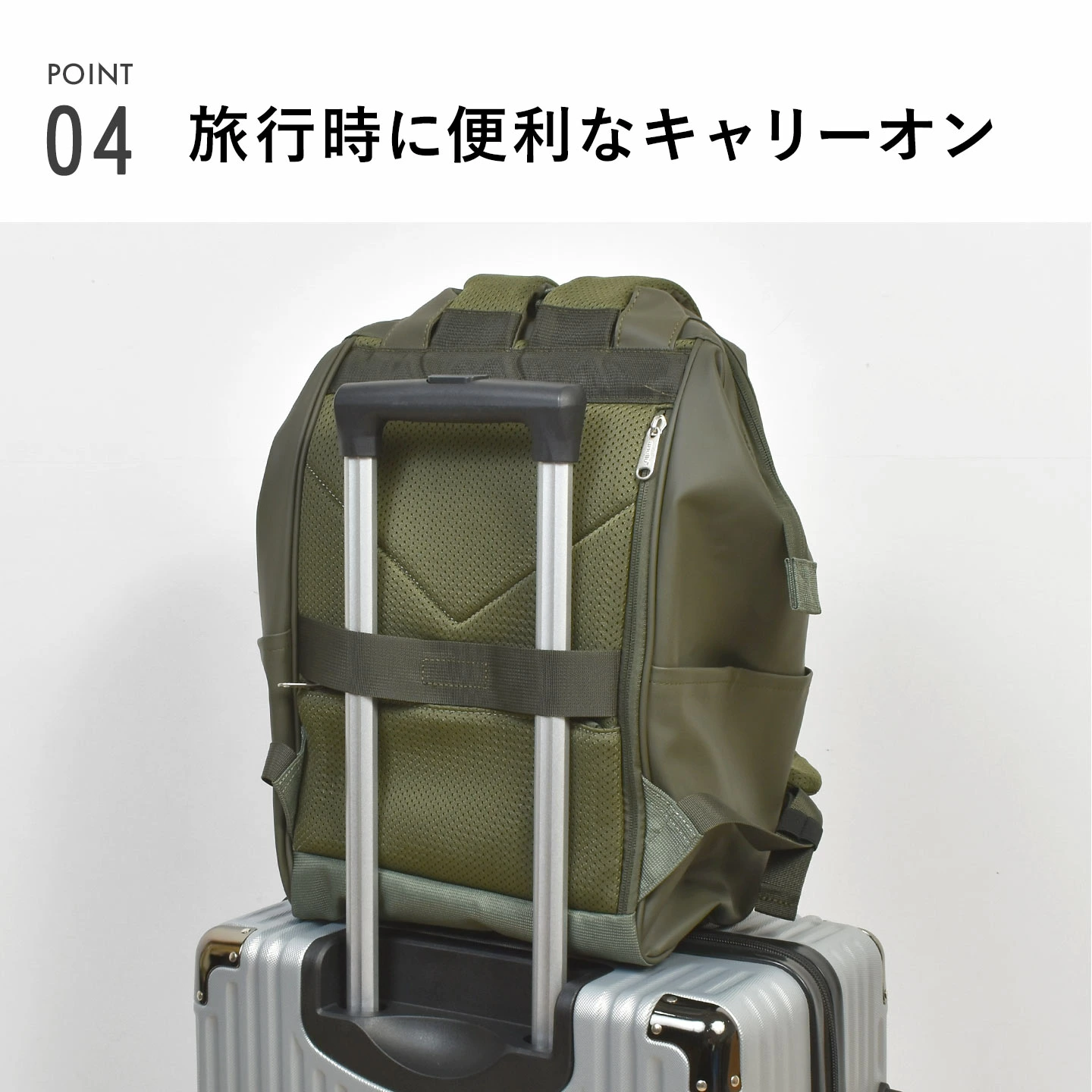 【SEEK 口金リュック R】耐水、撥水に優れた生地が普段使いからビジネスまで幅広く活躍◎ユニセックスで使えるSEEK(シーク)シリーズの多機能口金リュック。マットな質感の耐水生地は、汚れや水がしみにくく、サッと拭き取る事ができ、裏地も撥水素材で雨の日でも気軽に使えます。口金仕様のメインルームは開口部が大きく開き、荷物の出し入れが楽々。15インチ対応のPCポケット、キャリーオン、セキュリティポケットも備わっており、通勤・通学・出張にも便利。メインルームに直接アクセスできる背面ファスナー付きで、リュックを下ろさなくても中の荷物を取り出せるのも◎デザイン性、機能性にこだわった使い勝手の良いリュックです。