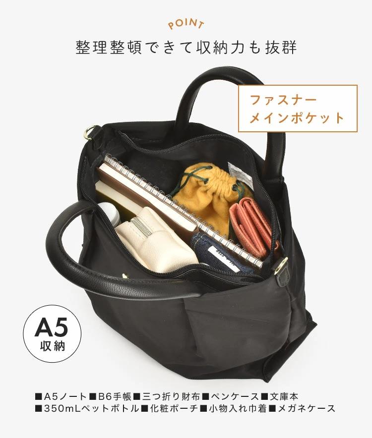 【SABLE 10ポケット2wayトート】SABLE(サブレ)シリーズの10ポケット2wayトートバッグ。軽くてやわらかなナイロン生地とナチュラルカラーの合皮を使用した、おしゃれで落ち着いたデザイン。両面はっ水仕様で雨の日も安心です。広めのマチが付いた18Lの大容量で、通勤・通学のデイリーユースから1泊旅行、マザーズバッグにもぴったり◎取り外し可能なショルダーベルト付きで肩掛けや斜めがけもできるので、荷物が多い日でもスタイルを変えて快適に持ち歩けます。