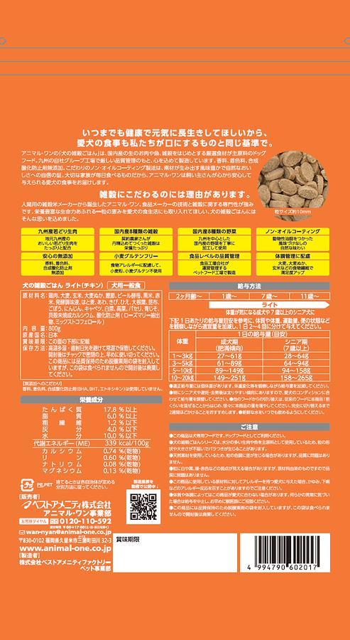 内容量:800g × 10個入り (重量8000g) ワンパック dog food――――――――――――――――――ノン・オイルコーティング、小麦グルテンフリー、香料・着色料・合成酸化防止剤無添加!ロングセラー商品「犬の雑穀ごはん」は、九州産の若どりと国内産8種類の雑穀をミックスした、かつお風味のナチュラルなドックフードです。――――――――――――――――――「犬の雑穀ごはんアダルト」に比べ脂肪分は35%オフ!さらに塩分控えめで、体重が気になる成犬や7歳以上のシニア犬におすすめです。――――――――――――――――――普段の主食としてはもちろんのこと、手作り食中心のワンちゃんの栄養補助食としてもお使いいただけます。――――――――――――――――――<原材料>鶏肉、大麦、玄米、大麦ぬか、鰹節、ビール酵母、黒米、赤米、発酵調味液、ハト麦、あわ、きび、ひえ、大根葉、昆布、ごぼう、にんじん、キャベツ、白菜、高菜、パセリ、青じそ、貝殻未焼成カルシウム、酸化防止剤(ローズマリー抽出物、ミックストコフェロール)――――――――――――――――――<栄養成分>たんぱく質|17.8 %以上脂質|6.0 %以上粗繊維|1.2 %以下灰分|4.0 %以下水分|10.0 %以下代謝エネルギー|339kcal/100gカルシウム|0.74 % (乾物)リン|0.60 % (乾物)ナトリウム|0.08 % (乾物)マグネシウム|0.13 % (乾物)――――――――――――――――――<給与方法>下記1日あたりの給与量目安を参考に、体質や体重、運動量、便の状態などを観察しながら適宜量を加減し、1日2~4回に分けて与えてください。一日あたりの給与量目安(単位:g)ライフステージ 成犬期体重 |7歳以上|体重管理1kg|28|272kg|47|453kg|64|614kg|79|755kg|94|896kg|107|1027kg|121|1148kg|133|1269kg|146|13810kg|158|14911kg|169|16012kg|181|17113kg|192|18214kg|203|19215kg|214|20216kg|224|21217kg|235|22218kg|245|23219kg|255|24220kg|265|25121kg|275|26022kg|285|27023kg|294 27924kg|304|28825kg|313|29726kg|323|30627kg|332|31428kg|341|32329kg|350|33230kg|359|340――――――――――――――――――●適正給与量には個体差があります。体重変化等を観察しながら給与量を加減してください。●特にシニア犬や避妊・去勢後は太りやすい傾向にありますので、愛犬のコンディションに合わせて給与量を調整してください。●他のフードからの切り替えは、従来のフードに本商品1割くらいを混ぜることからはじめ、徐々に本商品の量を増やしてください。完全に切り替えるまで2週間ほどかけることをおすすめします。●新鮮な水をいつでも飲めるようにしてください。
