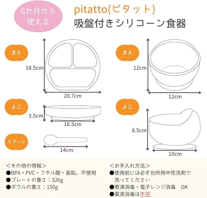 「現役の保育士 兼 幼稚園教諭も推薦」 6か月から使える、pitatto(ピタット)のシリコン製プレートとスプーン付きボウルのお得な3点セット。