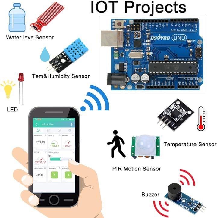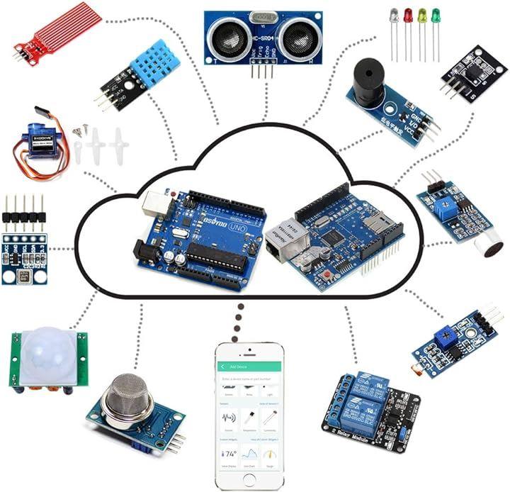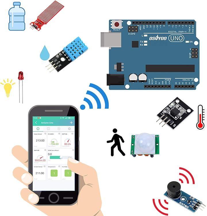 ・本商品にはLEDやブザーに始まり、サウンドセンサーや煙センサー、温湿度センサーなど実生活でも火災警報やエアコン操作に必要な部品を同封しており、各部品をインターネット経由でAdroid / IOS APPまたはWebブラウザから遠隔操作できます。