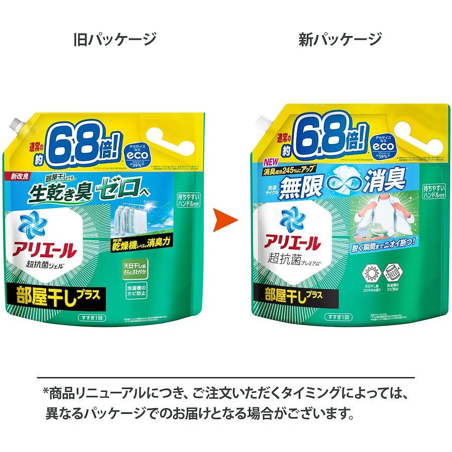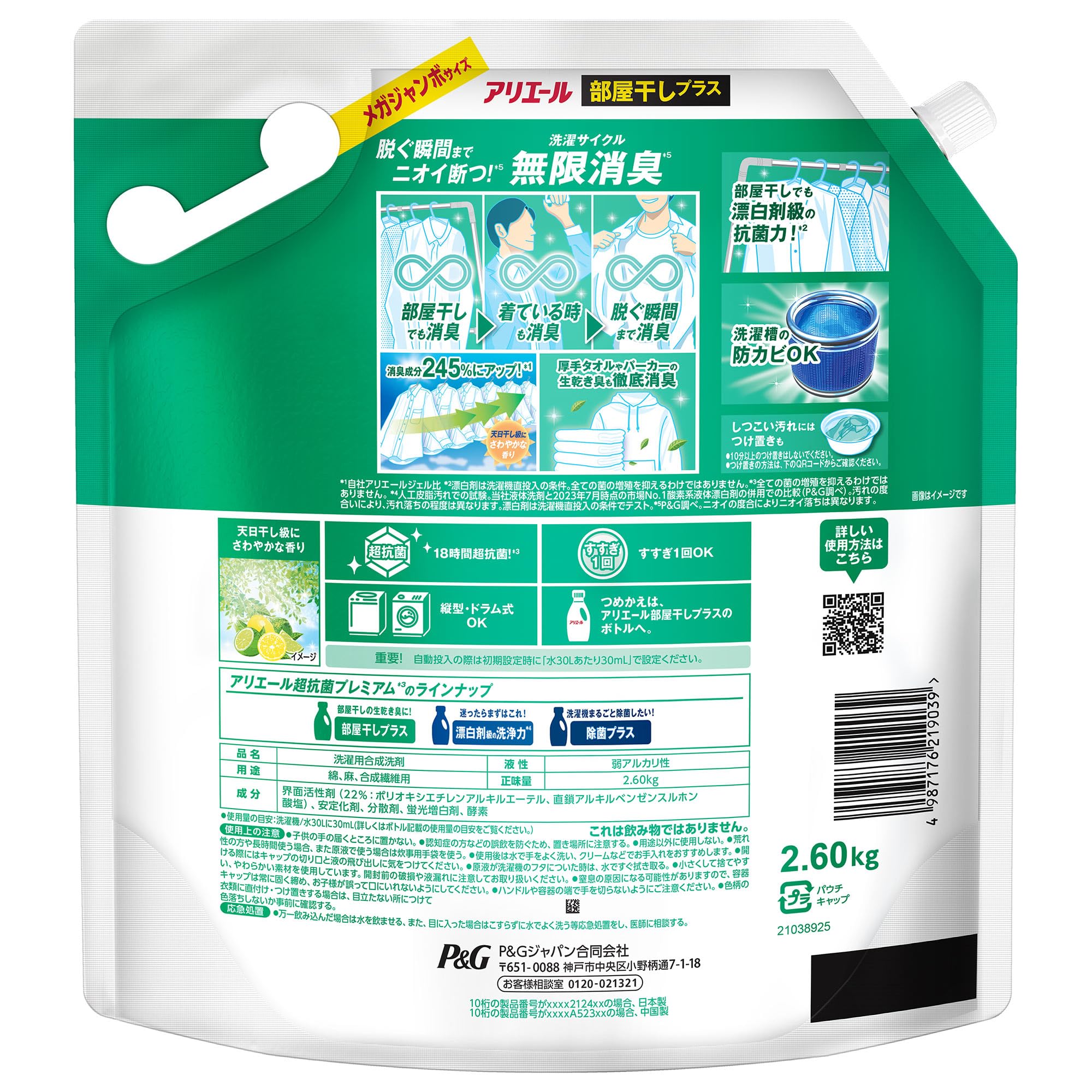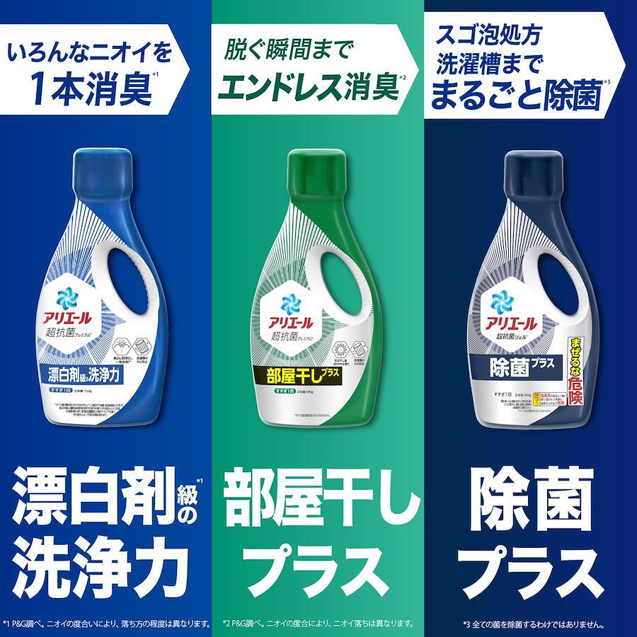 アリエール 洗濯洗剤 除湿乾燥機レベルで生乾き臭ゼロへ*。部屋干し・夜干しでもすっきり。 *P&G調べ。ニオイの度合いにより、落ち方の程度は異なります 消臭成分200%アップ* *自社従来品対比 天日干し級にさわやかな香り。厚手タオルやパーカーの生乾き臭も徹底消臭 *P&G調べ。ニオイの度合いにより、落ち方の程度は異なります。 洗濯槽クリーナーなしで洗濯槽防カビOK。18時間つづく超抗菌。 *カビは除去できません すすぎ1回OK。タテ・ドラム式対応。自動投入洗濯機にも。 洗濯洗剤