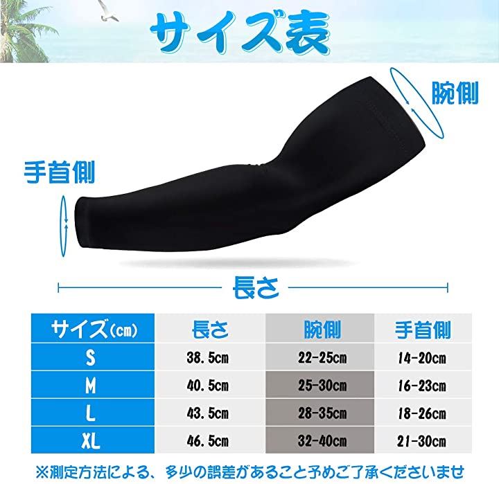 「サイズ目安」Sサイズ:長さ約38.5cm、腕側約22-25cm、手首側約14-20cmMサイズ:長さ約40.5cm、腕側約25-30cm、手首側約16-23cmLサイズ:長さ約43.5cm、腕側約28-35cm、手首側約18-26cmXLサイズ:長さ約46.5cm、腕側約32-40cm、手首側約21-30cm*アームカバーのサイズは衣類と異なっていますのでご注意ください。