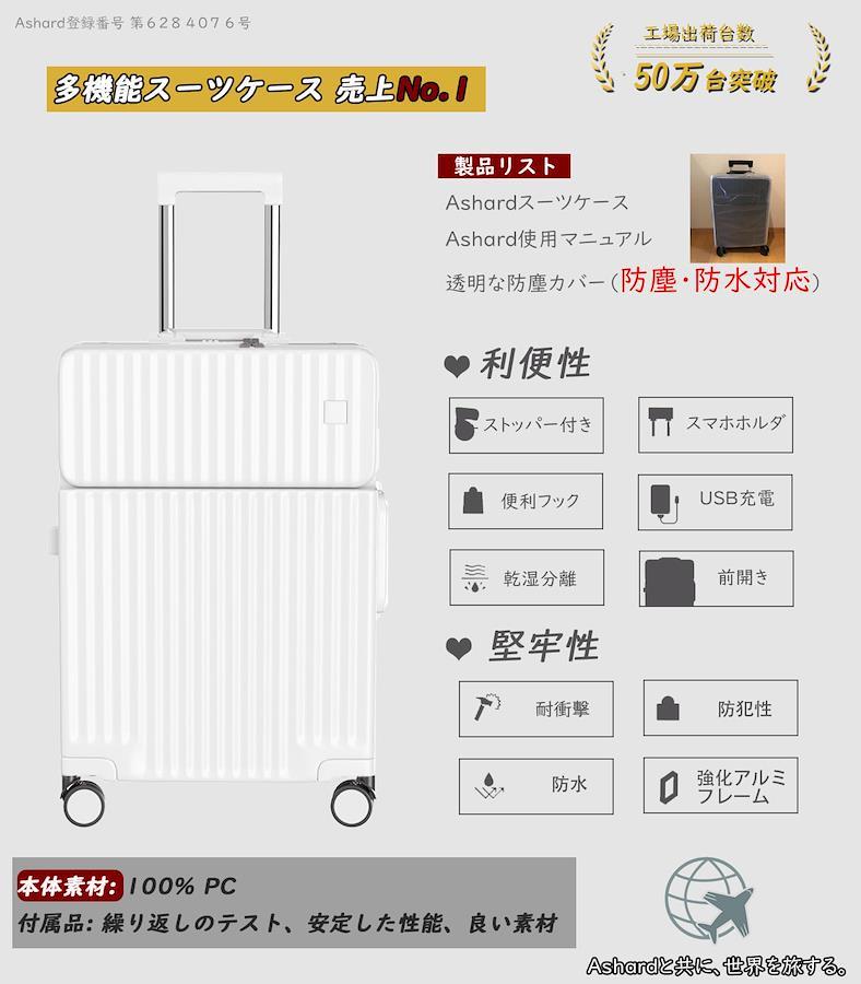 「キャスター ストッパー付き 、USB+Type C充電ポート付き 、 カップホルダーとスマホルダーを付く」 ASHARDフロントオープンシリーズのバージョンアップモデルです。走行中の揺れる電車内でもストッパー(ブレーキ)機能でピタっと自立。乗降時や座席の離着席時などではすぐにストッパー解除ができるのでスムーズに移動を再開することができます。スーツケースにモバイルバッテリーを収納するポケットがついており、 USB+Type Cポートの充電口が外にあることで、いつでもどこでも充電できます。便利な折りたたみ式ドリンクホルダー付き。バックカップホルダー、ミルクティーカップ、傘いつでも配置でき、旅行をより便利にすることができます。レバーの上部にはスマホルダーが付いているので、フライトの待ち時間に両手が自由になり、外出先でもリラックスできます。