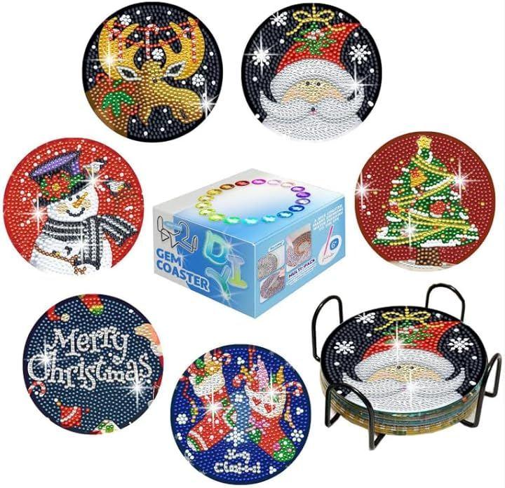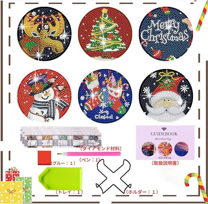 「ダイヤモンドアートコースターセットパッケージ内容」 サンタクロース/雪ダルマ/クリスマスツリーなど ダイヤモンドアートコースター:6枚 コルクマット:6枚 コースターホルダー:1台 カラフルなダイヤモンド:1セット ビーズトレイ:1個、ダイヤモンドペン:1本 グルー:1個 チャック付ビニール小袋:5枚 日本語取扱説明書付