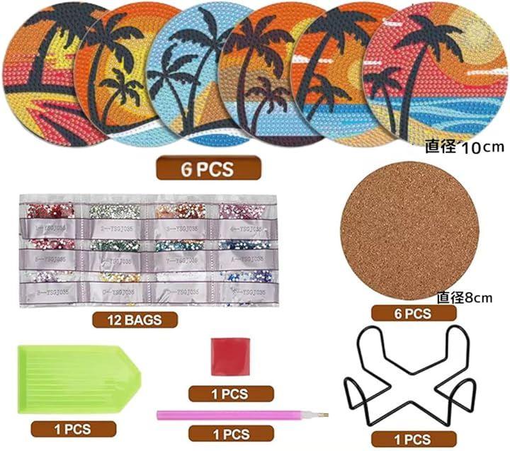 「ダイヤモンドアートコースターセットパッケージ内容」 *パームツリートロピカル ダイヤモンドアートコースター:6枚 *コルクマット:6枚 *コースターホルダー:1台 *カラフルなダイヤモンド:1セット *ビーズトレイ:1個、ダイヤモンドペン:1本 *グルー:1個*チャック付ビニール小袋:5枚 *日本語取扱説明書付