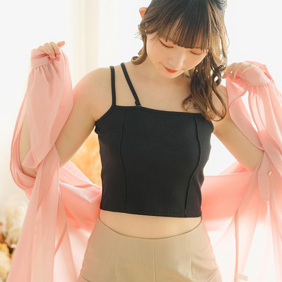 【素材】涼しげで伸縮性のあるテレコリブ素材を使用。程よく厚みがあり、透けにくいですが、淡色カラーの場合はインナーにご注意ください。カップは付いておりませんので、ヌーブラやストラップレスブラなどの下着をご着用ください。