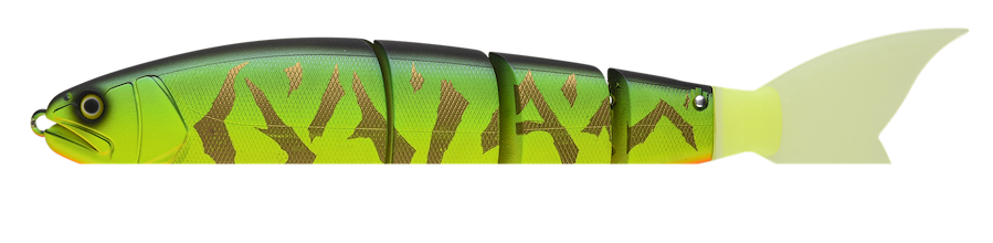 ファストリトリーブ時の凄まじい動きのライブ感、デッドスティッキング時の静の中の動、 そしてエイトトラップという狂気的な魔力を持った釣法、この3つの魔力を持ったジャイアントベイト今までのジャイアントベイトに無かった超高速リトリーブを多連結ボディで可能にし、高速巻きでも安定したスイム姿勢をキープすることで逃げ 惑うベイトを極限まで演出、ストラクチャーに潜む早い動きにしか反応 しないデカバスを仕留めます。更にタイトで超ハイピッチなスイムアク ションと多連結ボディが可動時に発するサウンドでスレたデカバスを 誘い出し、デッドスティッキング時には多連結ボディとシリコンテール の生物的で艶めかしい動きがスレたデカバスのバイトを誘発させます。 そして狂気の魔力を持ったエイトトラップ釣法。足元まで来たデカバス を完全に狂わせ、今迄完全に諦めてきた全てのフィッシュイーターにもう一度スイッチを入させることができる釣力はまさに魔力。『ジャイアントベイトの新境地」魔力の封印を解き放つのは貴方だ!!!